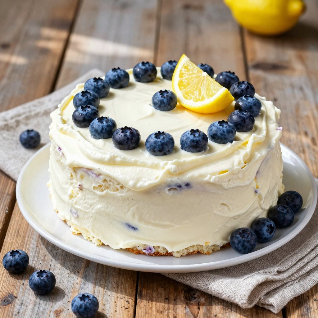 - Frost the cooled cake and garnish optionally with blueberries and lemon slices.