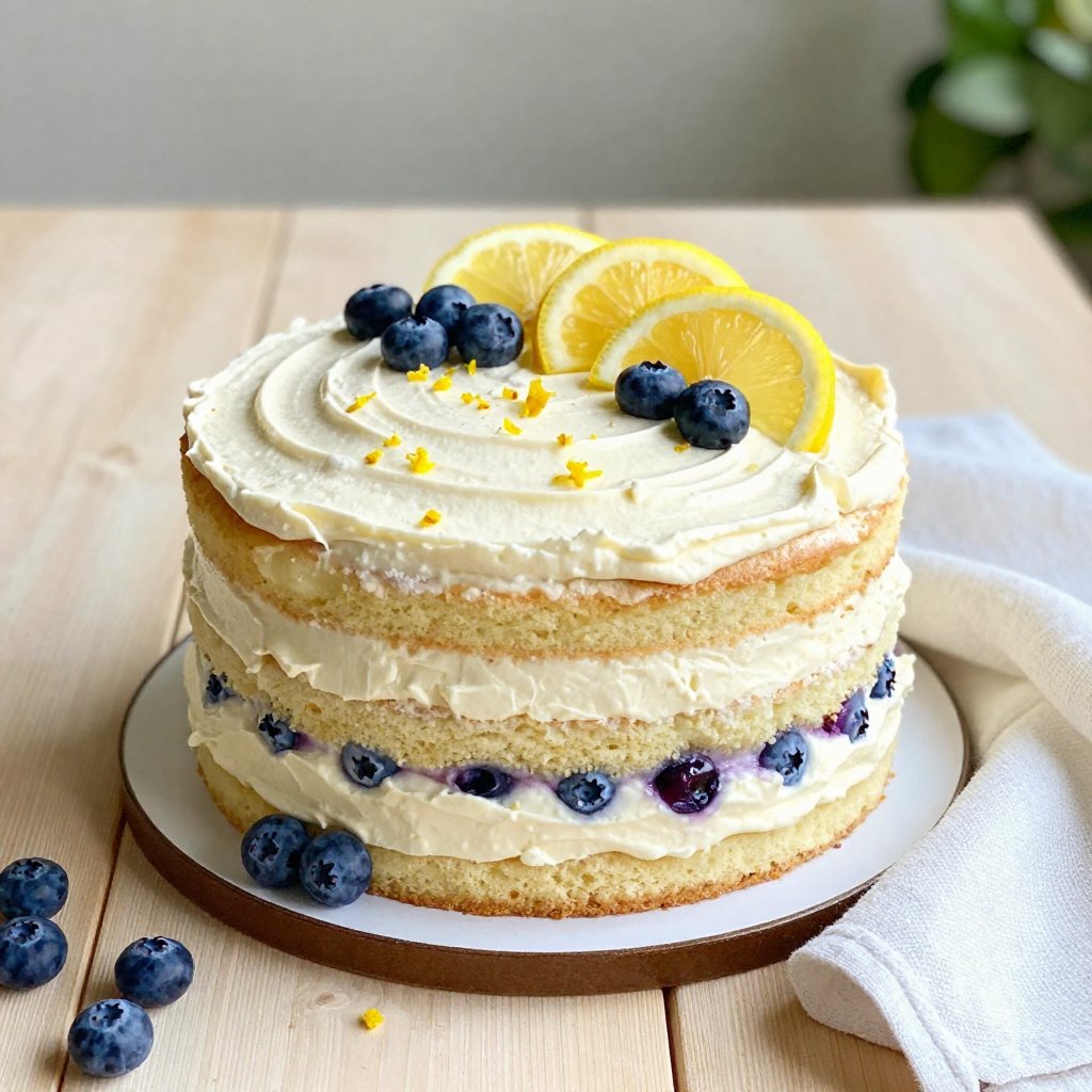 A delightful Lemon Blueberry Layer Cake featuring moist lemon-infused cake layers, a creamy mascarpone frosting, and a sweet blueberry compote. Perfect for any celebration!